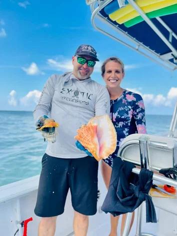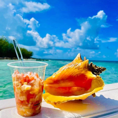 Come with us on a Conch Diving Adventure! It’s so rewarding to spot these beautiful creatures in the ocean, dive them up , and then have a fresh conch ceviche treat onboard with fresh fruits and vegetables! Delicious! It’s a bonus to get to watch the Captain take them out of the shell, clean them and prepare the ceviche!